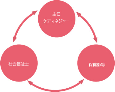 地域包括支援センターには、主任ケアマネジャー・社会福祉士・保健師等が配置されています。