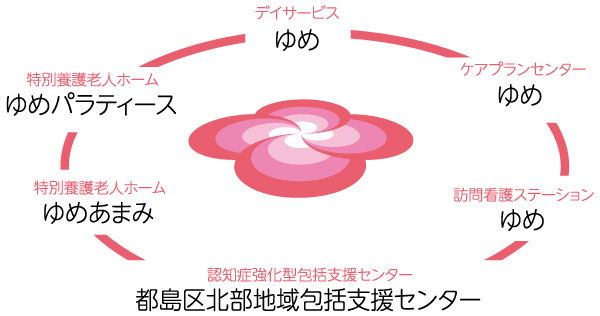 デイサービス ゆめは、ケアプランセンター ゆめ、訪問看護ステーション ゆめ、都島区北部包括支援センター、特別養護老人ホーム ゆめあまみ、特別養護老人ホーム ゆめパラティースと連携することで、入所や在宅などご利用者様の状態に合わせたトータルケアの体制を構築しています。