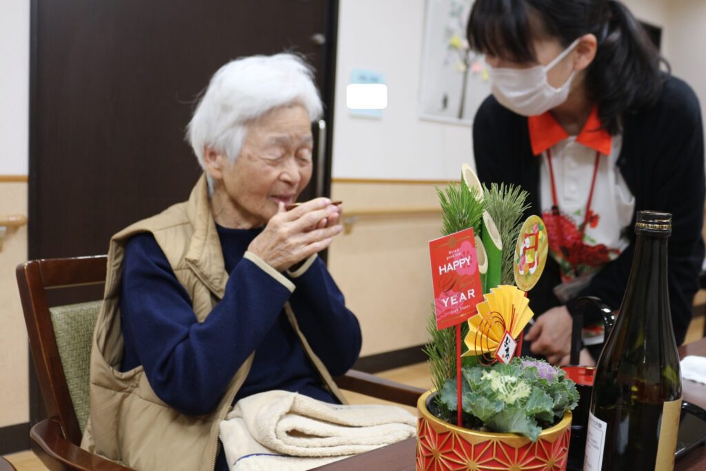 お屠蘇(おとそ)は、 「年の初めにこれを服すると年中の厄災を避け、福寿を招く」 と伝えられています。 ゆめパラティースでは、ご利用者さまとお屠蘇で新年を迎えることが恒例となりました。 酒杯に祝い酒が注がれ、盃に口をつけられると皆さま表情もゆるみます。 心なしか頬が赤らむ方や、元来お酒好き…
